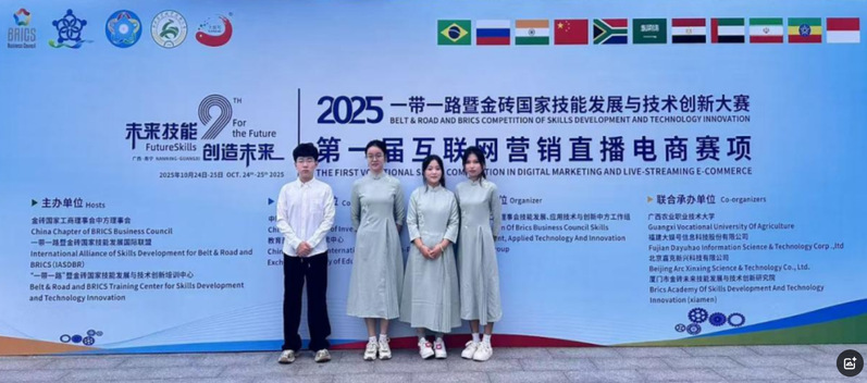 10月26日,2025“一带一路”暨金砖国家发展与技术创新大赛首届互联网直播电商赛项全国总决赛在广西南宁顺利闭幕。由我校经济管理学院23级电商(单)王佳佳、24级旅游管理张文秀、胡圆圆以及24级电商郑瀚四位同学组成的参赛团队,凭借扎实的专业能力、稳定的现场发挥和高效的团队协作,在激烈竞争中脱颖而出,荣获全国总决赛二等奖,为学校争得荣誉。
