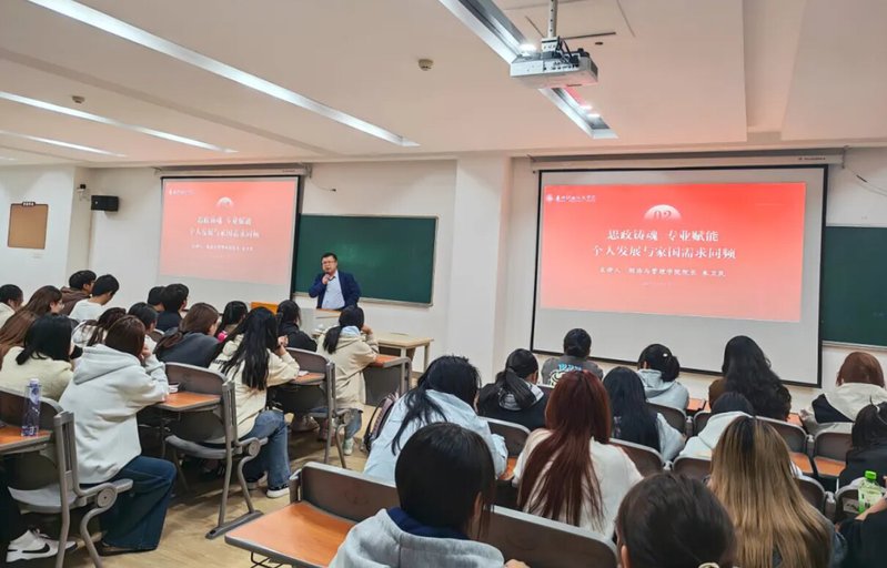 课上,党总支书记陈玉以“思想引领”为核心,结合当前时代背景与经管学科特色,从理想信念、品德修养、责任担当三个维度展开讲授。他强调,新时代经管学子要听党话、跟党走,将个人发展融入国家战略与社会需求,在学习中锤炼过硬本领,在实践中涵养高尚品德。陈玉书记结合自身求学与工作经历,分享了“坚守初心、脚踏实地” 的成长感悟,并寄语新生:“大学是梦想启航的地方,希望大家以坚定的信念、饱满的热情、务实的作风,在经管这片沃土上成长成才,成为有理想、敢担当、能吃苦、肯奋斗的新时代青年。”