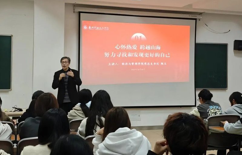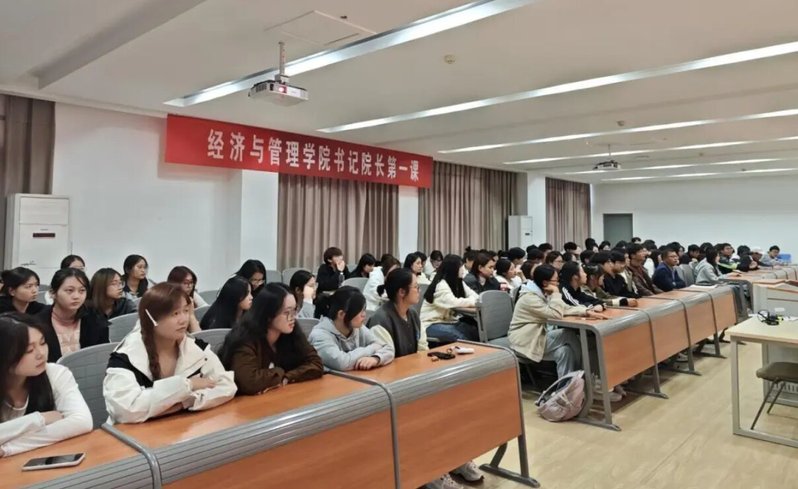 学院党总支书记陈玉、院长朱卫民分别以“心怀热爱,跨越山海,努力寻找和发现更好的自己”和“思政铸魂,专业赋能,个人发展与家国需求同频” 为主题,为全体新生带来了一堂既有思想高度、又有实践温度的开学第一课,经管院2025级新生及班主任代表参加此次课程。