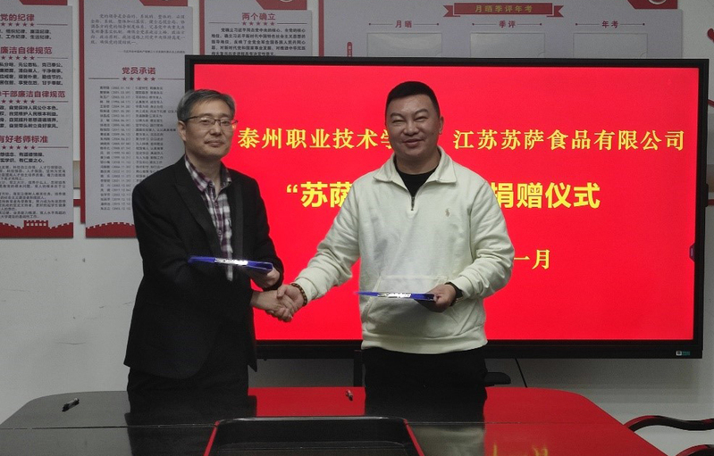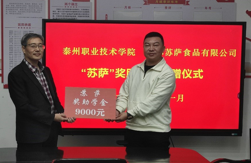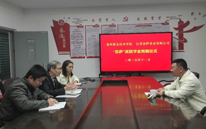 11月17日下午,苏萨食品有限公司奖助学金捐赠仪式在泰州职业技术学院经济与管理学院举行。苏萨食品有限公司董长刘保兴,经济与管理学院党总支书记陈玉及相关教师出席仪式。