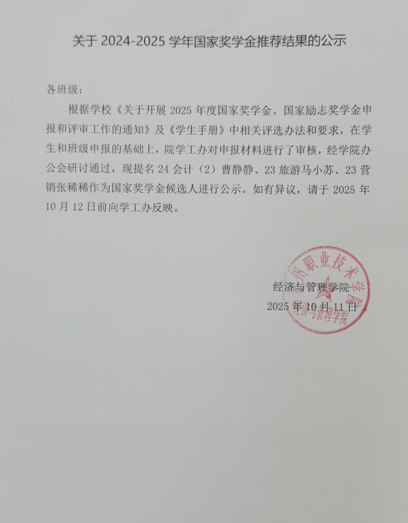 关于2024-2025学年国家奖学金推荐结果的公示