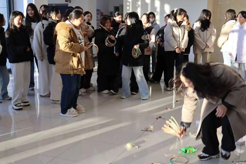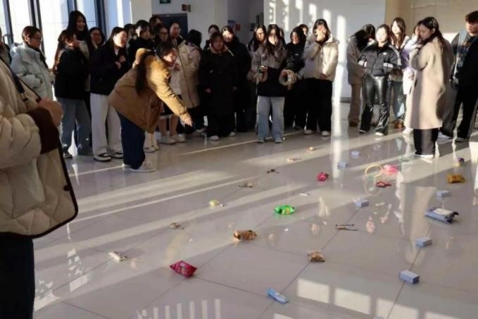 活动现场暖意融融,精心设置的套圈游戏区刚开放便排起长队。同学们手握彩圈,凝神瞄准、轻轻抛出,一个个彩圈在空中划出优美弧线。成功套中玩偶、文具等奖品的同学欢呼雀跃,没套中的也相互鼓励,现场笑声、掌声此起彼伏。除了趣味十足的套圈游戏,活动还穿插了“你画我猜”等互动小游戏,同学们在协作与比拼中拉近了距离,将学业压力抛诸脑后。